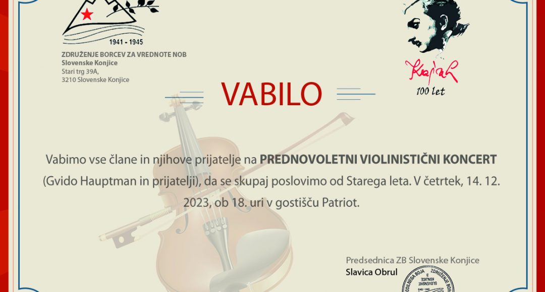 Vabimo vse člane in njihove prijatelje na PREDNOVOLETNI VIOLINISTIČNI KONCERT (Gvido Hauptman in prijatelji), da se skupaj poslovimo od Starega leta. V četrtek, 14. 12. 2023 ob 18. uri v gostišču Patriot.